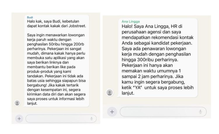 Selain itu, mereka juga sering menyamar sebagai Jobstreet dan menghubungi para kandidat melalui SMS, aplikasi chat, maupun platform media sosial.